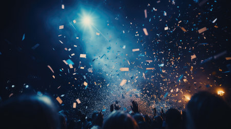 Energetic concert crowd celebrating under colorful confetti during an electrifying live performance at night