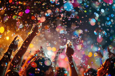 A vibrant music festival with a lively crowd dancing under colorful lights and bubbles. The atmosphere is electric and exciting.