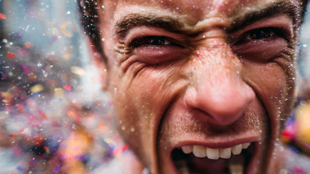 Close-up of a very frustrated man shouting with his mouth open while confetti falls around him.
