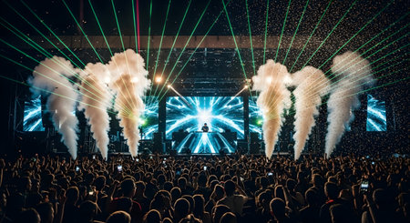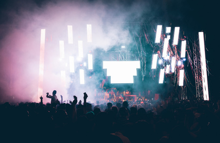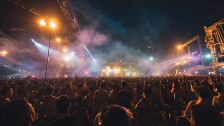 Stage lights and crowd of audience with hands raised at a music festival. Fans enjoying the party vibes.