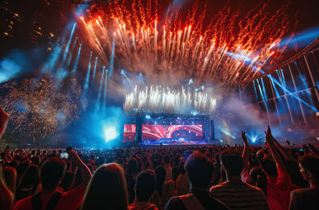 showing concert crowd cheering under a shower of gold confetti and dramatic stage lighting creating an energetic and celebratory atmosphere. resolution...