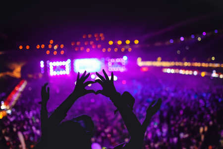 heart shaped hands showing love at festival. Silhouette against concert Lights background
