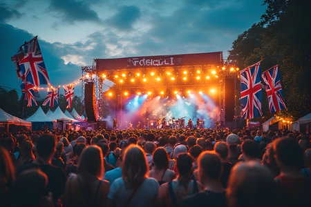 A vibrant outdoor music festival scene captured at dusk, featuring a large, enthusiastic crowd gathered in front of a brightly illuminated stage where a band performs. Union Jack flags are prominently