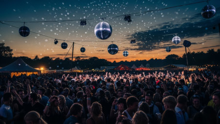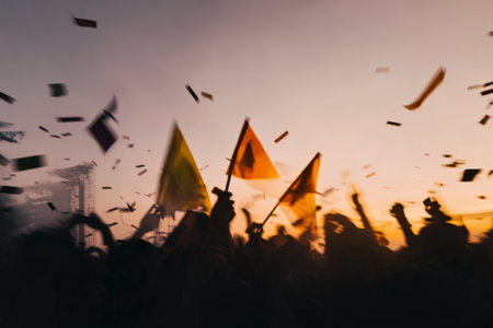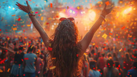 Evening outdoor music festival atmosphere enriched by colorful confetti cascading under vibrant lights, igniting joy