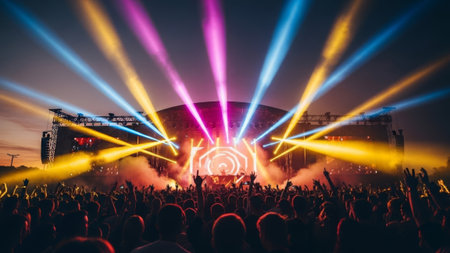 A stunning view of a vibrant concert with colorful lights illuminating an enthusiastic crowd at a music festival. The atmosphere buzzes with energy and excitement.