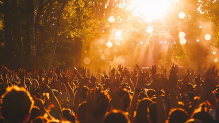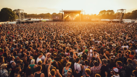 Thousands of music fans enjoying an outdoor festival at sunset with raised hands.