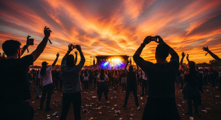 A vibrant scene at a music festival during sunset. A large crowd is gathered, with many people raising their hands and taking photos. The sky is painted with hues of orange and purple, creating a stunning backdrop. The silhouettes of the attendees and the stage lights add to the festive atmosphere.