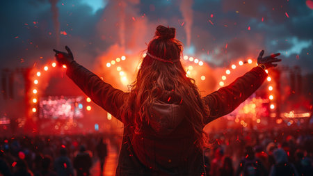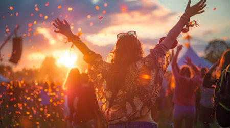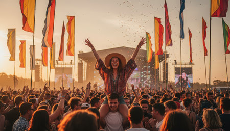 A vibrant outdoor festival scene captures a joyful woman on the shoulders of another person, arms raised in exultation amidst a large, enthusiastic crowd. Confetti flutters through the air, adding to the celebratory atmosphere. Numerous colorful flags and banners line the event space, with a stage structure visible in the background under the warm glow of dusk. The scene embodies excitement, community, and the shared experience of live entertainment.