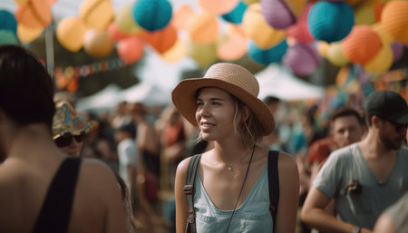 Someone enjoying a summer festival with crowds of people and colorful decorations. with Generative AI