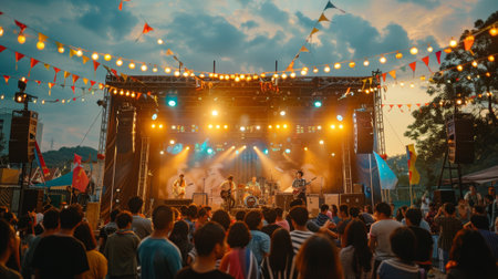 Outdoor music festival with crowd enjoying a live band performance at sunset with colorful stage lights.