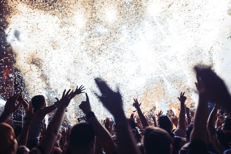 Energetic concert crowd celebrating under colorful confetti during an electrifying live performance at night
