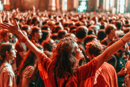 A woman is standing in a crowd of people, with her arms raised in the air. Concept of excitement and joy, as the woman is celebrating or participating in a lively event
