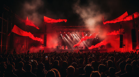 A crowded concert hall with scene stage lights, live show performance, with people silhouette, dance floor during a concert open-air festival