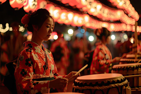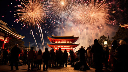 Orient New Year, Japanese Traditional Holiday Festivals with Shrines, Stalls, Lanterns, Yukata Drums, Fireworks at Nights, Generative AI Illustration