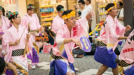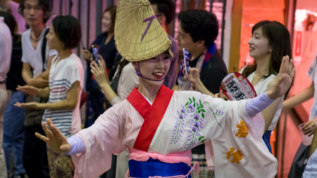 Tokyo, Japan - August 2018: Japanese performers dancing traditional Awaodori dance in the famous Koenji Awa Odori festival.