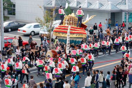 Niihama, Japan - October 17, 2019: View of the Niihama Taiko Festival scene, with taikodai drum floats, released balloons, participants and crowd, Ehime, Shikoku Island, Japan