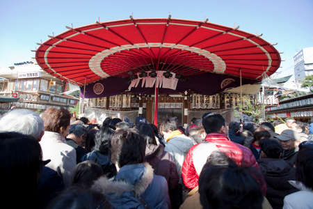 Kyoto, Japan - February 3 2018 - Setsubun events in Kitano tenmangu Kyoto,Japan. Setsubun means division of seasons It is used to mark the end of winter.People throw and scatter roasted beans inside and outside.