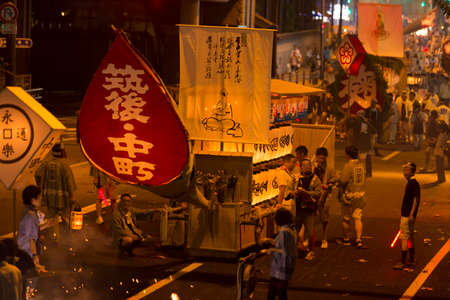 Niihama, Japan - October 17, 2019: Men in traditional clothing lifting a taikodai drum float, as part of the Niihama Taiko Festival, Ehime, Shikoku Island, Japan