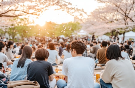 Japanese sakura Cherry blossom festival, picnic in city park with young adults enjoying springtime, AI generated