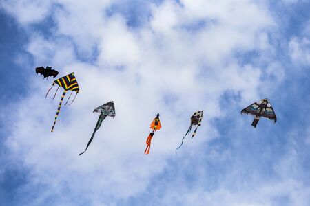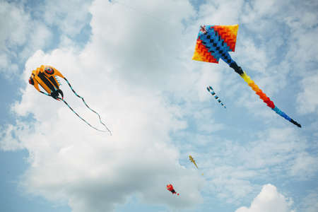 festival of kites, kites in the sky on a sunny day. Various kites flying on the blue sky