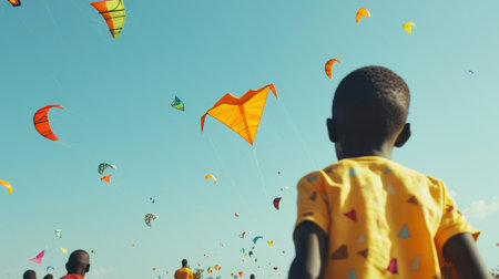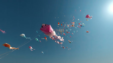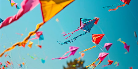 Vibrant and colorful kites dance in the clear blue sky, creating a playful ambiance filled with joy and freedom. A perfect day for outdoor activities.