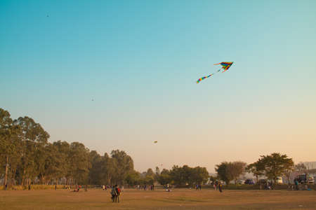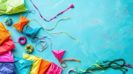 Happy Makar Sankranti Hindu holiday dedicated to sun deity Surya, colorful flying kites being flown, time for expressing gratitude and celebrating harvest season. banner, copy space, greeting card
