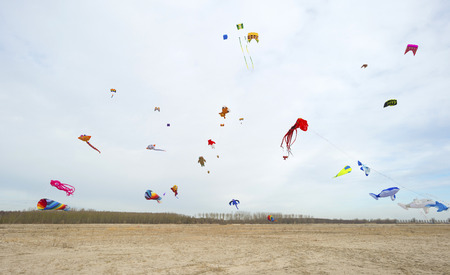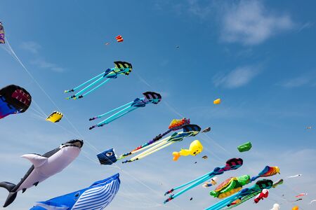 Kite festival in Poland. Many kites flying in the sky.