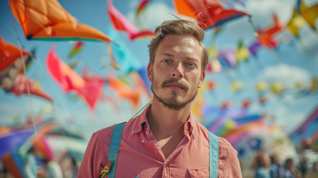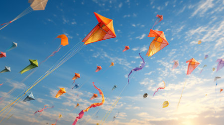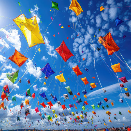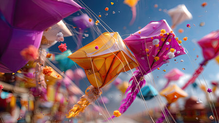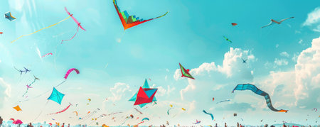 A stunning display of colorful kites soaring high against a vibrant sky, capturing the essence of joy and celebration in outdoor festive gatherings.