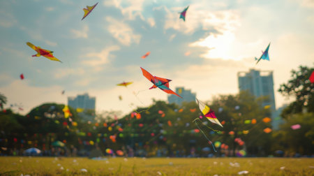Glimpses of colorful kites soaring high in the sky carried by gentle breezes above the park