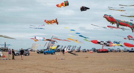 St Annes, Lancashire/United Kingdom - September 14 2024: St Annes Kite Festival. Colorful kites fill the sky as families enjoy a fun day at the beach, celebrating the annual kite festival