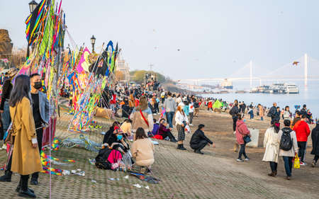 Wuhan China, February 14, 2021: Crowd of people enjoying 2021 Chinese new year week holidays on Yangtze riverbanks in Wuhan Hubei China