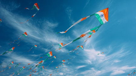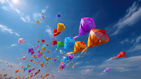 A stunning display of colorful kites soaring against a clear blue sky, capturing the essence of joy, freedom, and adventure during a vibrant festival.