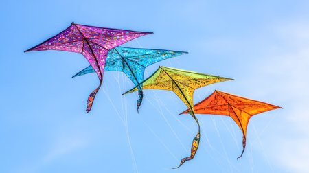 Three vibrant kites soar gracefully in the clear blue sky, creating a vibrant and lively scene, Bright colored kites soaring against a vivid blue summer sky, AI Generated