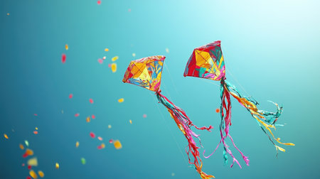 Two vibrant kites soar gracefully against a bright blue sky, surrounded by colorful confetti. This image captures the essence of joy and fun during outdoor celebrations.
