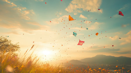 A vibrant display of colorful kites fills the sky during sunset, creating a joyful atmosphere over a lush landscape. Ideal for themes of fun and freedom.