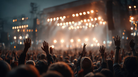Stage lights and crowd of audience with hands raised at a music festival. Fans enjoying the party vibes.