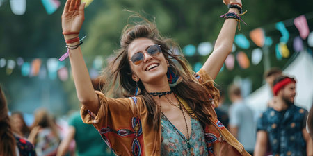 A vibrant summer festival scene featuring a joyful young woman celebrating under the sun. She radiates happiness with her carefree pose, basking in the lively atmosphere surrounded by a diverse crowd.