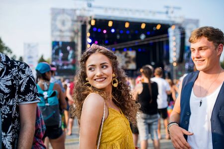 Group of young caucasian friends walking on music festival when one woman is turning toward camera