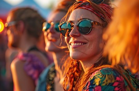 Young women enjoying a music festival at sunset, their happiness and excitement palpable in the warm light.
