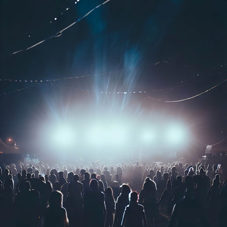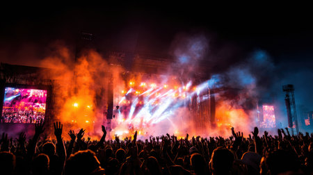 Stage lights and crowd of audience with hands raised at a music festival. Fans enjoying the party vibes.
