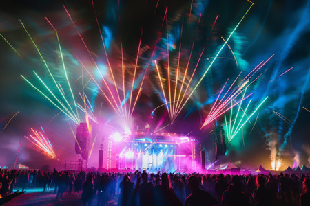 A stunning view of a vibrant concert with colorful lights illuminating an enthusiastic crowd at a music festival. The atmosphere buzzes with energy and excitement.