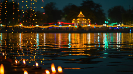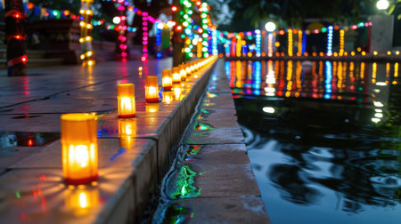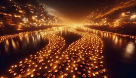 Hundreds of small diya lamps illuminating a river during Diwali festival, Ai generated image