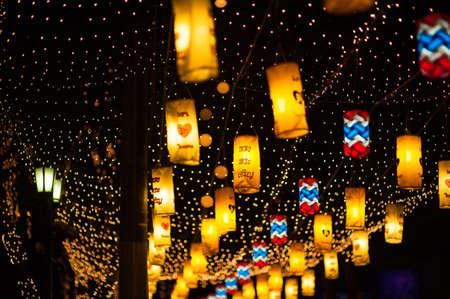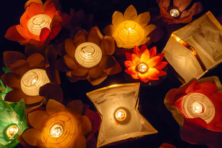 Floating colored lanterns and garlands on river at night on Vesak day for celebrating Buddha's birthday in Eastern culture, that made from paper and candle