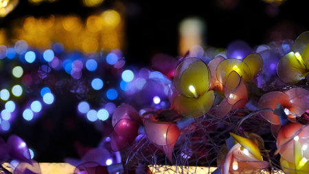A close-up shot of illuminated plants with bokeh lights in a dark setting, creating a magical atmosphere.