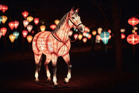 Chinese zodiac horse walking through a lantern festival at night, illuminated by the soft glow of lanterns, creating a magical and serene atmosphere.