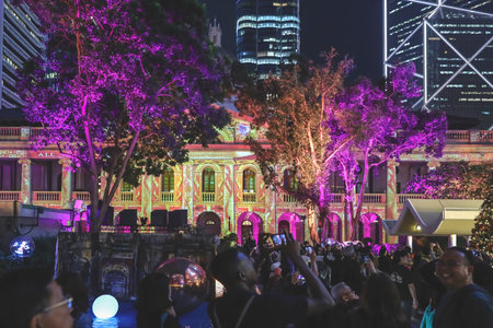 An evening scene shows a large crowd celebrating in a city. Bright lights emanate from the buildings and illuminate the people and falling particles, creating a festive atmosphere. The composition emphasizes the energy and joy of the event. Suitable for various commercial and editorial applications.
