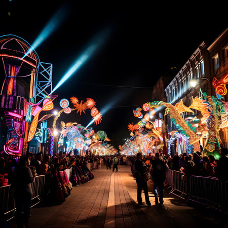 Crowds walk through a vibrant street adorned with colorful lights during a festive celebration under a night sky.