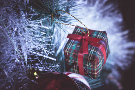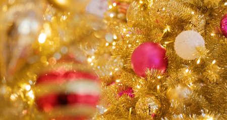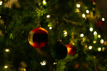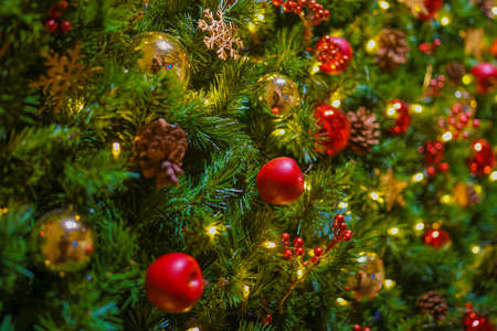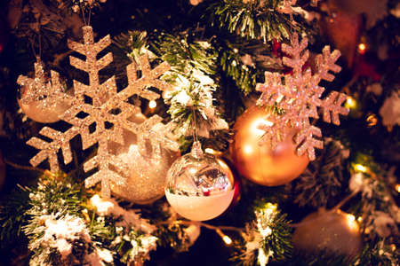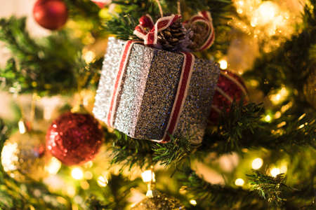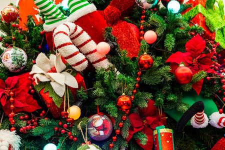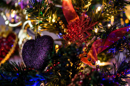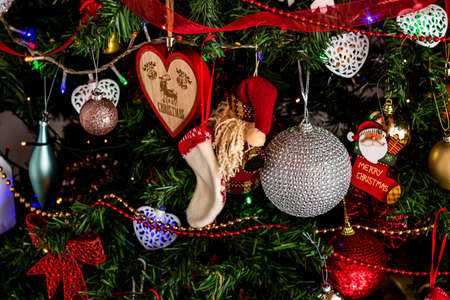 Beautiful Christmas ornaments and decorations hanging in the Christmas tree