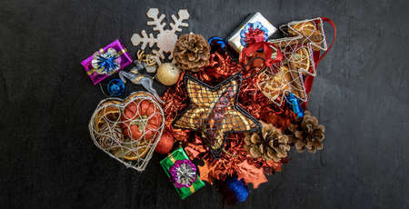 Background of Christmas decorations and gifts with multi-colored