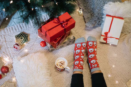 Top view of legs with Christmas presents and cappuccino